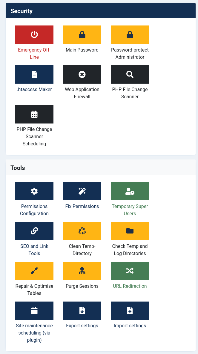 Der erste Abschnitt beschäftigt sich mit der Sicherheit des Joomla! und wie es diese verbessern kann. Der erste rote Knopf ist gleich ein Notfallausschalter. Er kann mehr als "nur die Seite offline setzen". Wird dieser Knopf betätigt, wird niemandem außer dem zur Zeit angemeldeten Administrator der Zugriff auf die Seite gewährt (Stichwort: IP-Sperre!). Ein Knopf, den man tatsächlich nur im Notfall betätigen sollte.