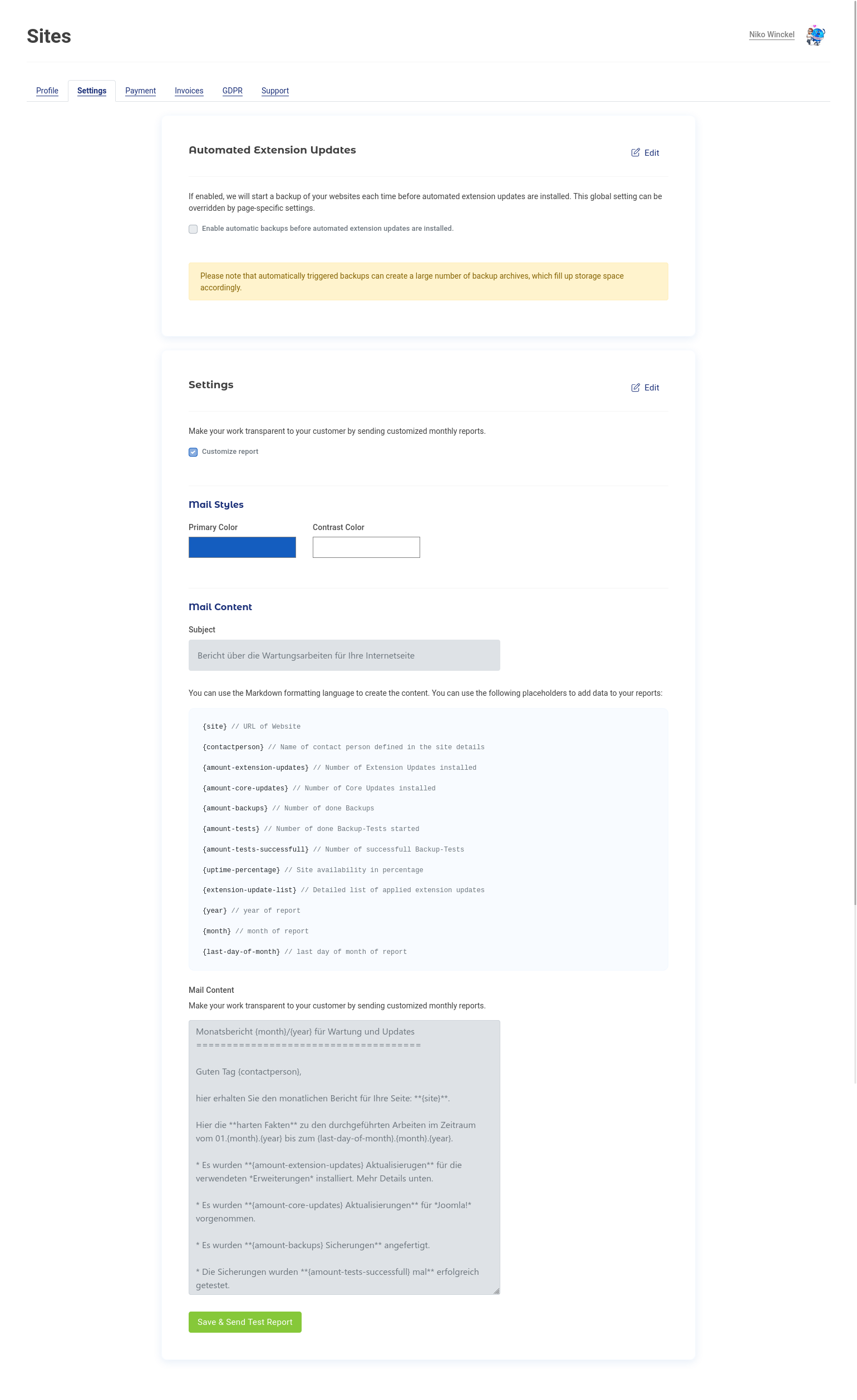 Eine wirklich tolle Funktion sind die monatlichen Berichte über die ausgeführten Tätigkeiten. Denn genau das möchte man doch seinem Kunden transparent machen, der bei dir als Administrator:in einen Wartungsvertrag abgeschlossen hat. Meist sieht man das Ergebnis ja nicht, weil alles funktioniert. Hier kommt die Report-Funktion von BackupMonkey ins Spiel. Mittels Markdown (eine rudimentäre Auszeichnungssprache) https://de.wikipedia.org/wiki/Markdown kann man eine E-Mail an den Kunden und sich selbst schicken lassen, die monatlich Bericht erstattet, was alles durchgeführt wurde. Dabei kann man passende Platzhalter nutzen, die dann eine kundenspezifische E-Mail erzeugen, die genau die Berichte zur entsprechenden Kundenseite liefert. Details dazu findet man in den Screenshots die hier aufgeführt sind.
