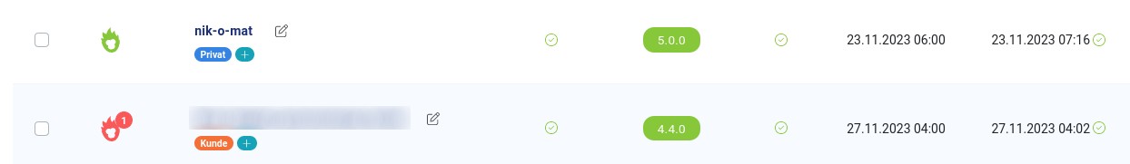 Die Detailansicht zeigt eine Seite für die es keine Updates gibt (grüner Affenkopf) und eine Seite, für die es ein Update gibt (roter Affenkopf mit Zähler der Aktualisierungen). Man erkennt auch das das letzte Update, den letzten Test, den Status der Seite und des SSL-Zertifikates und auch die derzeitige Joomla!-Version