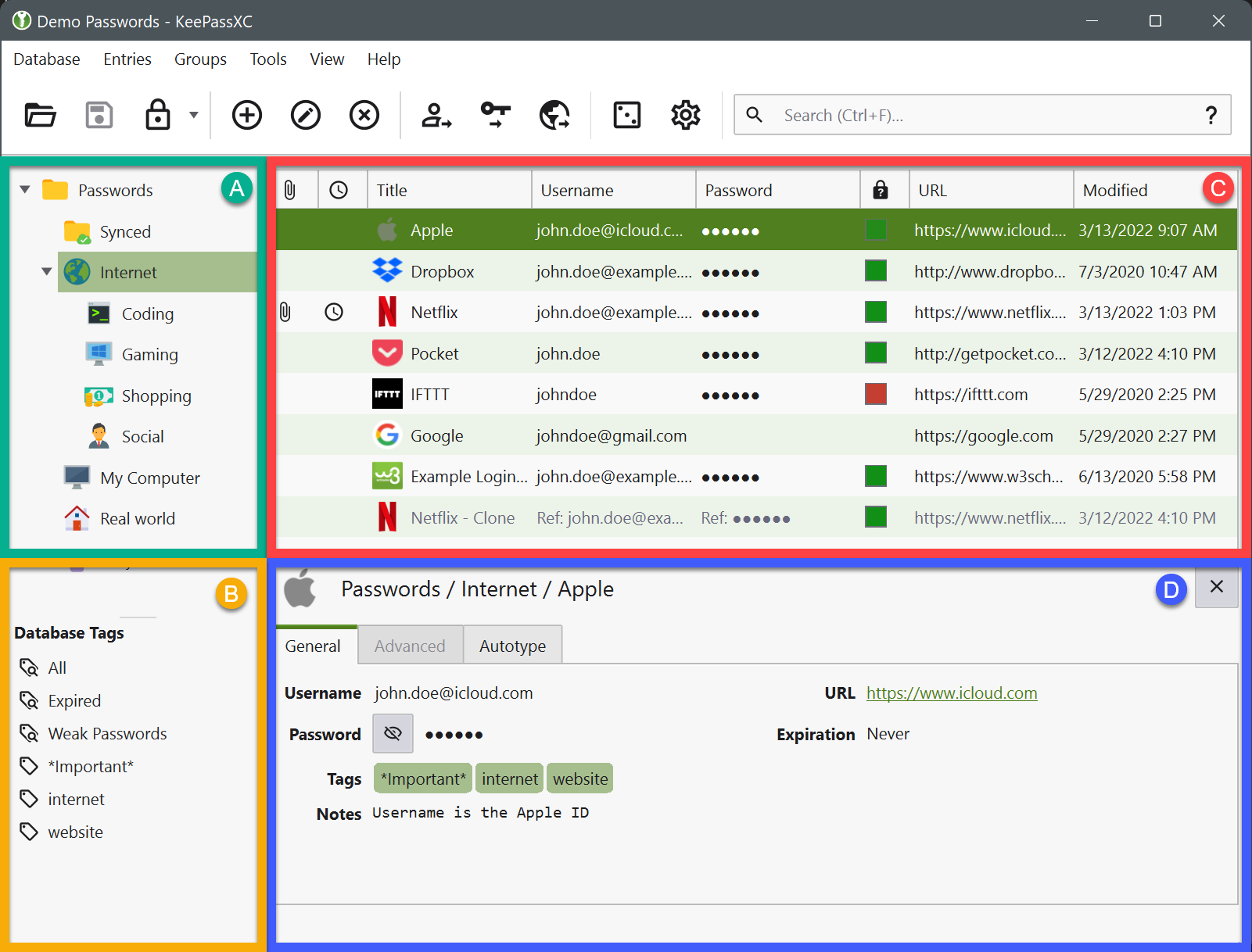Die Antwort ist: Gar nicht! Ich merke mir nur noch sehr wenige Passworte. Für die Passwortverwaltung am PC nutze ich KeepassXC (https://keepassxc.org). Keepass ist ein kleines Programm, zur Verwaltung von Passworten. In diesem Programm ist es möglich, wie in einer Art digitalen Karteikasten, auch in Kategorien sortiert, Zugangsdaten abzulegen. Die Passworte werden in einer Passwort-Datei gespeichert. Ich merke mir also nur noch mein ordentliches Passwort für diese Datenbank.